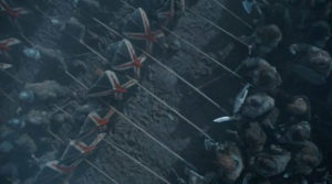 7 La escena del enfrentamiento con escudos fue agregada por los guionistas. Si bien fue para ahorrar dinero y tiempo, lo cierto es que le dio más dramatismo al episodio.
