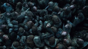 4 Si bien hubo muchos actores en escena, también el trabajo por parte de los vestuaristas fue arduo: cientos y cientos de falsos cuerpos humanos y animales fueron producidos y vestidos para la ocasión. Esta pila a continuación lo demuestra.
