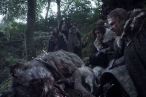 8 El encuentro con el ciervo y la loba muertos en el bosque, ni bien comenzó la primera temporada, demostrarían lo que se vendría: las caídas de Robert Baratheon (ciervo) y Eddard Stark (lobo).