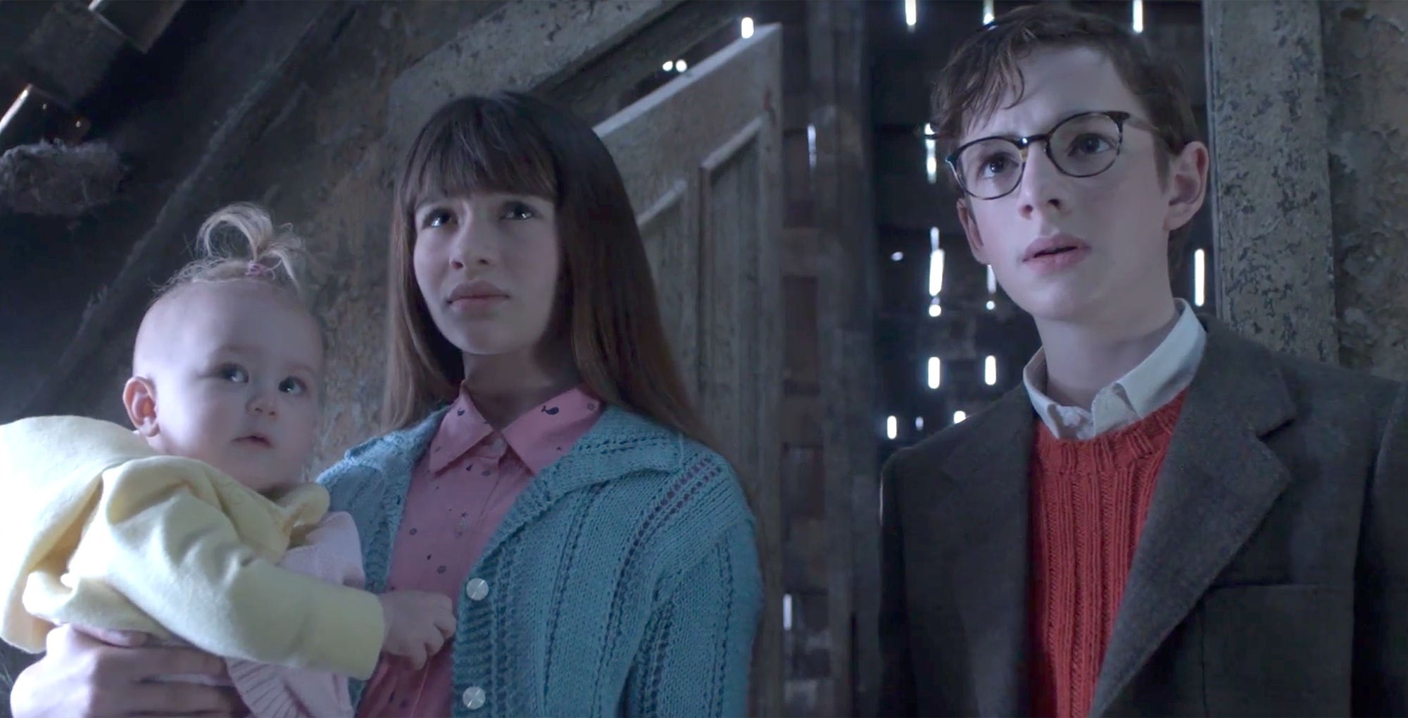 Pero también hay que mencionar a quienes protagonizan la historia, los pequeños. Malina Weissman (Violet Baudelaire), Louis Hynes (Klaus Baudelaire) y Priestley Smith (Sunny Baudelaire). Los tres pequeños no sólo destacan y lucen en sus papeles sino que además logran que uno pueda tomarles cariño y simpatía, queriendo que de una vez por todas resuelvan la historia familiar.