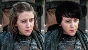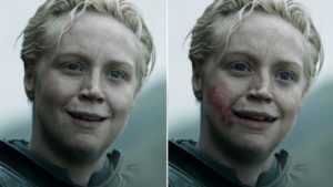 Brienne nunca se parecerá a la mujer descrita por George RR, que la presenta como alguien de cabello similar a un nido de ardillas, con unos pocos dientes prominentes, boca muy grande y labios muy gruesos, y una nariz rota. Conclusión: sólo se salvan esos ojos azules de niña.