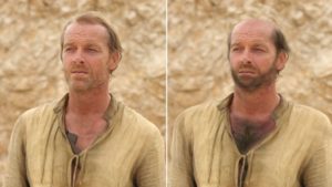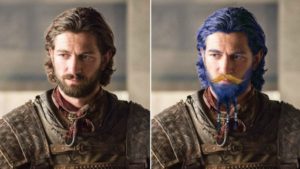 Lo de Daario Naharis es aleboso, pues deberíamos verlo con cabello y barba color azul -al igual que sus ojos-, más un bigote dorado.