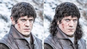 La principal diferencia del villano Ramsay Bolton yace en sus ojos, que en la historia son descritos como dos cubos de hielo sucio...