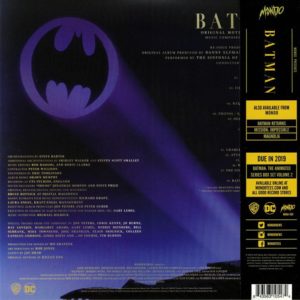 Desde que recibes el acetato en un empaque altamente protegido por el altamente exigente equipo Mondo te das cuenta de que eres poseedor de algo genial. El lomo removible con los créditos y características del vinyl le da un toque «japonés» (¿recuerdan los acetatos con esta característica?) cubriendo ligeramente el hermoso Batwing sobrevolando Gotham en la escena cúspide del filme de Burton. El arte de Kilian Eng se deja ver por demás detallado y con enormes conocimientos de la película, logrando una combinación de colores y tonos sublime, recordando al cinéfilo la lucha «del bien contra el mal» en negro y púrpura, algo que trasciende hasta el mismísimo vinilo, que combina ambos colores (o puede ordenarse en el negro regular).