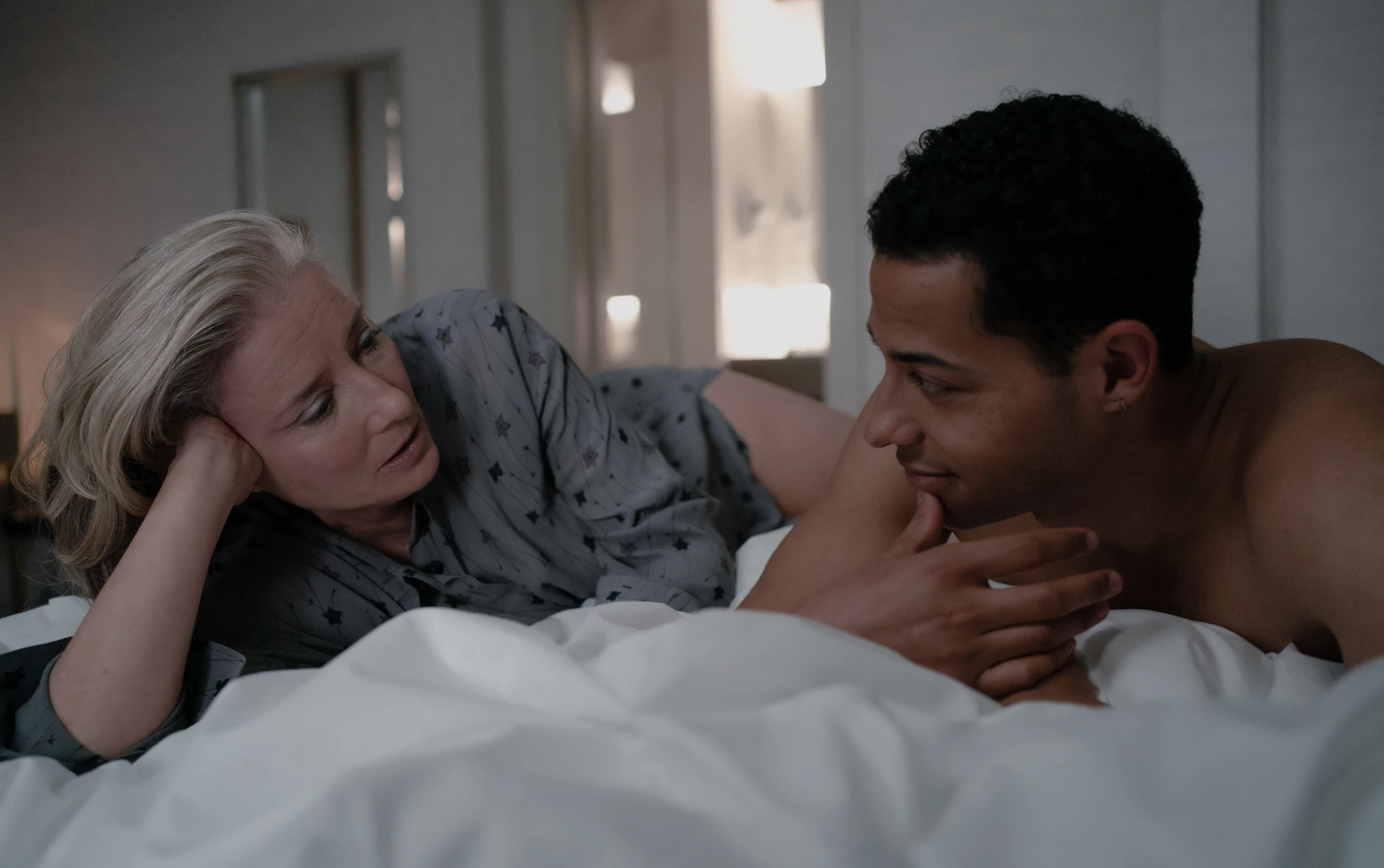 Good Luck To You, Leo Grande (Buena suerte, Leo Grande) es una película engañosa desde su tráiler. No lo menciono desde una perspectiva deficiente o negativa, todo lo contrario: desde los personajes se aborda esa anonimidad y asisten a una cita sexual bajo pseudónimos que encubren sus verdaderos nombres, por lo tanto sus verdaderas vidas. Pero aunque ambos llegan a ese lugar para tener una intimidad entre extraños, esta relación meramente sexual no es lo que logra que se quiten las caretas con las que se enfrentan el uno al otro: un hombre joven con buen cuerpo que seguramente se encuentra en sus treintas, con toda la seguridad que esto trae, frente una mujer madura que inventa tener frío y así taparse el cuerpo que para ella se encuentra caído y poco atractivo.