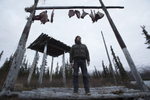 Picture Shows: Glenn stores his butchered moose meat on his meat pole in Chandalar, AK.
