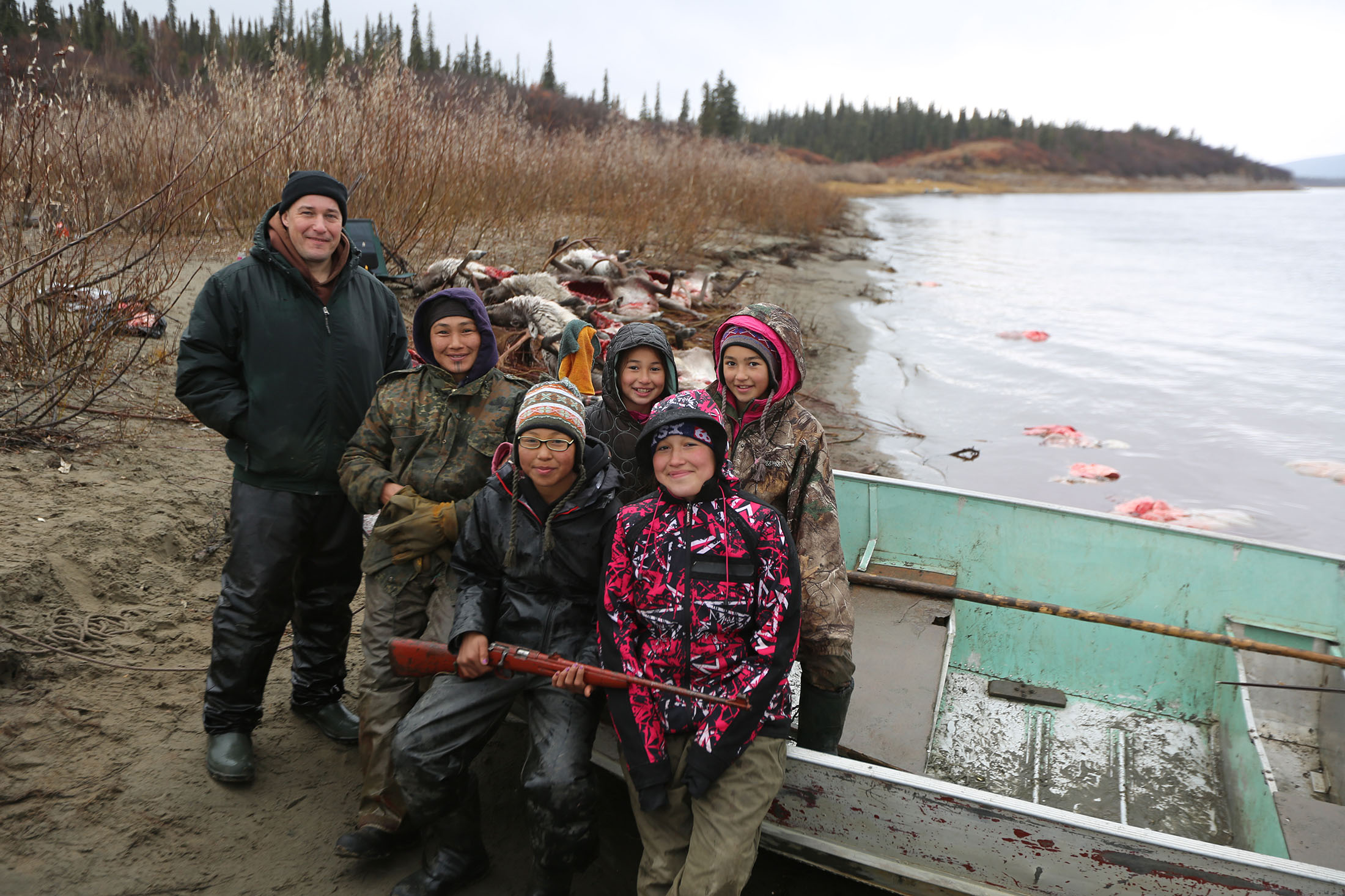 Picture Shows: The Hailstone family sits near the caribou they killed earlier in the day in Noorvik, AK.