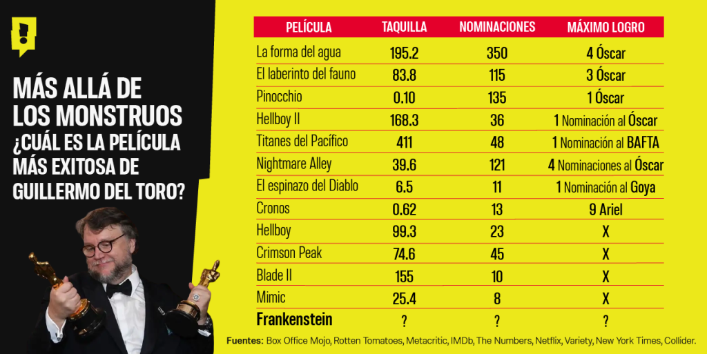Guillermo del Toro ha construido una filmografía tan singular como inconfundible. Desde sus primeras obsesiones góticas en Cronos hasta sus criaturas melancólicas en La Forma del Agua, y llegando a cristalizar su sueño de vida con Frankenstein, el cine del tapatío combina lo monstruoso con lo humano, lo artesanal con lo visionario. Pero más allá de la devoción crítica y el amor de sus seguidores, hay una pregunta que, curiosamente, pocas veces se aborda con datos duros: ¿cuál de todas sus películas ha sido la más exitosa?