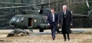 Como se muestra en el segundo episodio, un helicóptero destinado a apagar las llamas del reactor con arena y boro vuela cerca de los escombros y las espirales fuera de control antes de estrellarse contra el suelo. Si bien este accidente lamentablemente es cierto, el choque real ocurrió meses después de que las llamas del desastre ya se hubieran extinguido: en realidad, el helicóptero fue enviado al sitio del desastre como parte de un proyecto de ingeniería civil masivo diseñado para eliminar el riesgo de una reacción nuclear posterior y una segunda explosión.