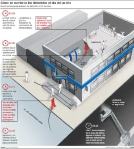 Además, mientras esto pasaba, en el banco reinaba el caos:Empezaron a llegar los ahorristas, desesperados. Todos querían saber si les habían robado. Los hacían pasar y les tomaban los datos, iban hasta la bóveda. Cuando volvieron a la calle, los fui buscando uno por uno y les pedí que me contaran cómo era el banco por dentro, a dónde estaban las cajas de seguridad, etc. Así armé un croquis que luego dimos en el diario como infografía. Fue tema de tapa todo el verano, cuatro páginas todo los días”, agregó De Corso, quien llegó al Banco Río a eso de las 16, pero se terminó yendo a las 3 de la mañana del sábado.