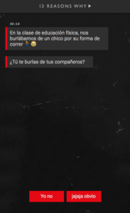 Como desde el primer momento y por amplias sinopsis de la serie sabemos que parte de los padecimientos de la protagonista están ligados al bullying, no quedaba duda que la acción concientizadora en algún momento iba a llegar, y para América Latina vino en forma de chat mobile en la que alguien nos cuenta confidencialmente sus culpas sobre algunas cosas que ha hecho en la escuela – como por ejemplo, burlarse de un compañero en la clase de gimnasia-, y nos pide interacción contestando si hemos hecho algo parecido alguna vez.