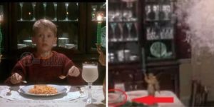 4 Otro error. Después que Kevin va a la tienda, se sienta para una comida tranquila: un plato lleno de deliciosos macarrones con queso y un vaso de leche. Todos los que han visto esta película recuerdan esta escena porque sus macarrones se veían muy bien. Sin embargo, lo que los espectadores pueden no haber notado es que una vez que aparecen Marv y Harry, el plato de Kevin se muestra brevemente en la mesa del comedor con diferentes alimentos.