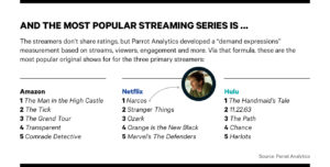 Mientras Netflix, Amazon y Hulu batallan por conseguir contenido de emisoras externas como: CBS, Warner Bros., Lionsgate, etc., sus shows originales ya rankean altísimo, con inversiones que superan los 5 billones de dólares. The Handmaid’s Tale (Hulu), The Man in the High Castle (Amazon) y Narcos (Netflix) son lo más popular del momento según Parrot Analytics, pero veamos un gráfico que además incluye el Top 5 de cada plataforma.