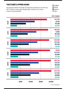YouTube tampoco se queda afuera de la batalla, que junto a Netflix son las proveedoras de video más usadas, al menos en Estados Unidos. Pero OJO, porque en ese campo es Amazon la que está creciendo a más velocidad últimamente.