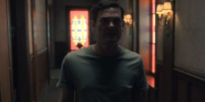 Episodio 7. Hugh trata de abrir la puerta de la habitación roja sin éxito. Justo cuando se detiene a mirarla, hay un fantasma asomado en la habitación del lado izquierdo.