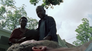 40 La presentación de Abraham + Rosita + Eugene frente a Tara en Inmates, de la cuarta temporada.