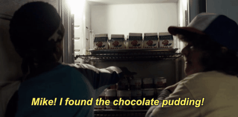 82 Carl comiendo pudding de chocolate en la temporada cuarta. PD: nos gusta mucho la alegría que refleja este gif, aunque sea de Stranger Things. 🙂