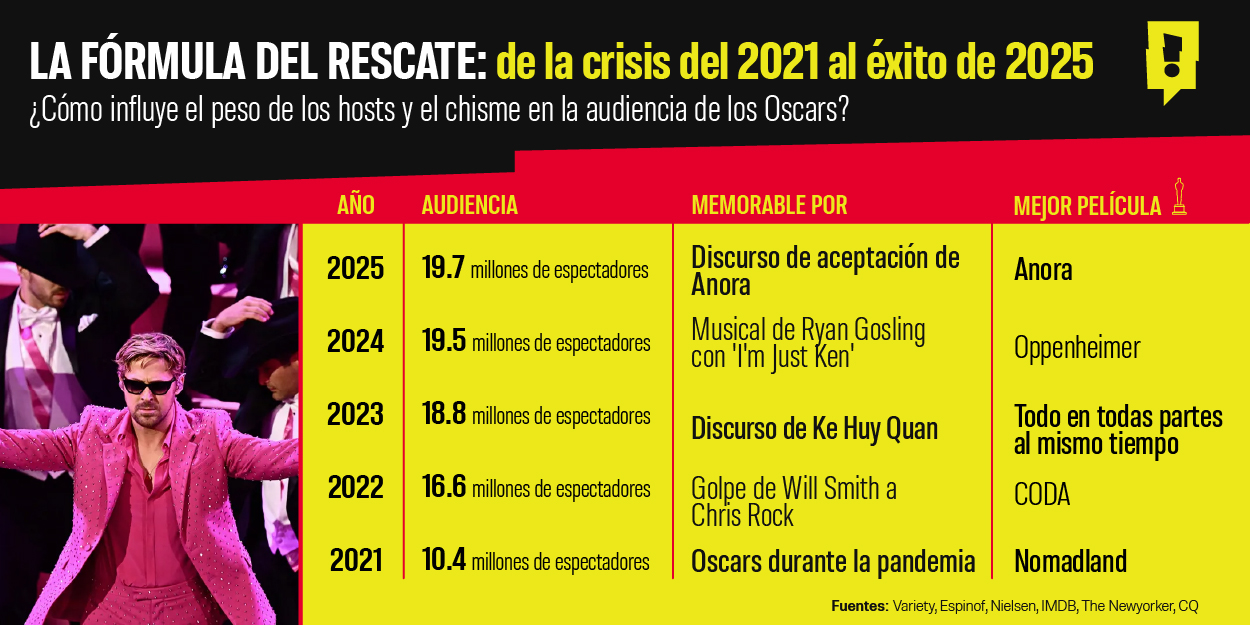 Desde su duración, su apertura, sus nominados, quién los conduce y hasta qué suceso o chisme marca la noche, estos factores han sido ingredientes clave para que esta ceremonia logre salir a flote y haya pasado de tener una de las audiencias más bajas en su historia en 2021. Ojo, también hay que tomar en cuenta que en ese momento se lidiaba con la pandemia, para retomar la cima en 2025.