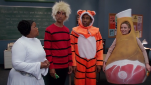 Las elecciones de Halloween de este capítulo son: Shirley como la Princesa Leia, Britta como un jamón, Abed y Troy como Calvin y Hobbes.