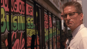 Casi no se encuentra con otros hombres blancos de clase media en su marcha a través de la sucia y caótica ciudad. Su primer contacto es con un coreano propietario de un mercado: lo insulta por su acento y sus precios; destroza su tienda. Pocos minutos después, ataca a dos latinos con un bate de béisbol; ellos intentan vengarse luego, pero mueren en el intento al sufrir un accidente de tránsito. Durante su camino sigue cruzándose con personajes bastante peculiares, pero la frutilla del postre es que nos enteramos que está distanciado de su esposa (interpretada por Barbara Hershey), quien presentó una orden de restricción en su contra.