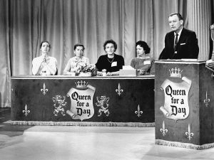 Tal fue el caso de Queen for a Day, programa radiofónico de 1945 que en 1951 saltó al cada vez más popular televisor y que basaba su formato en las entrevistas de los concursos de belleza. Participaban mujeres que debían relatar abiertamente las adversidades enfrentadas en su vida diaria y las razones por las que querían ser reinas por un día. La ganadora era elegida por aplausos, por lo que más allá de los argumentos, tanto el carisma como las lágrimas resultaban especialmente útiles.