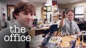 Las bromas de oficina aparentemente inofensivas… pero, sin embargo, la rivalidad está latente en estos dos dementes. Es el amor al odio, no sé si me explico. Si bien hay una suerte de poca importancia por parte de Jim, lo cierto es que la llama la mantiene prendida Dwight.