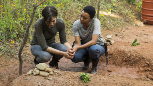 Teníamos ganas de saber qué había sido de la vida de Maggie. Junto a Sasha y Jesus se refugian en la Colonia Hilltop. Y parece ser que, a pesar del dolor, sigue adelante e incluso se resiste a mantener el reposo que le aconsejan por el embarazo y se une a la matanza de zombis con patadas, cuchillos, espadas y un tractor.