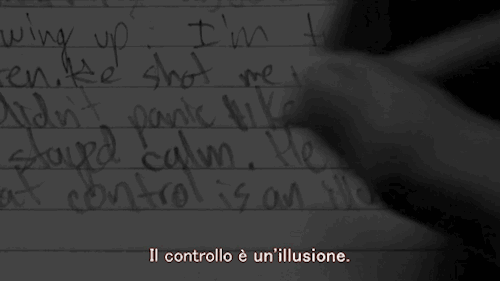 Lo peor no fue el disparo totalmente inesperado, lo más cruento fue la frase de Elliot: Él me disparó a la cabeza otra vez. No entré en pánico como la última vez. Luego escribe en su diario El control es una ilusión mientras una gota de sangre mancha el papel.