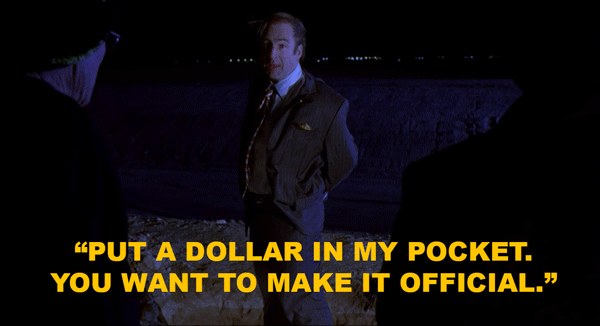 De la misma manera en que Saul Goodman se convierte en abogado de Walter y Jesse, es la manera en que Kim hace lo propio con Jimmy a quien le pide un dólar antes de hablar sobre lo que, su ahora cliente, le reveló a su hermano. Recordemos que Saul usa esa estrategia para proteger la confidencialidad con sus nuevos clientes, pero como Jesse no tiene un billte de un dólar, le entrega un billete de cinco y es así como empieza el pacto entre ellos.