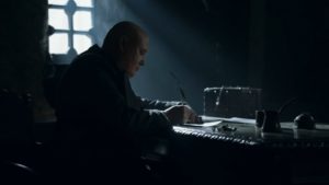 Antes de ser ejecutado hay dos momentos clave: por un lado el supuesto intento de envenenamiento de parte de Varys hacia la figura de la blonda (cosa que aún hoy se sigue comentando en el fandom); por otro lado, su última intriga, ya que lo vemos escribiendo algo así como “… no es el único Targaryen que queda, Rhaegar y Lyanna… su hijo aún vive, escondido por Eddard Stark… él es el verdadero heredero del Trono de Hierro…”.