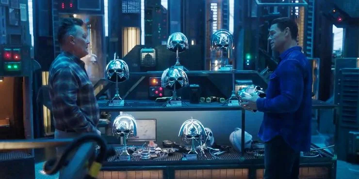 El padre de Peacemakertambién destaca uno que le permite al usuario respirar bajo el agua, ya que la placa de identificación reza «mundo submarino». El casco en sí parece estar estilizado con una aleta en la parte superior.