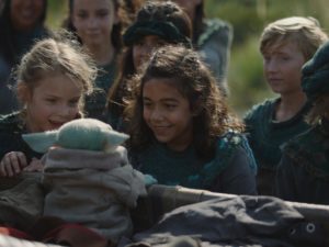 Después de verlo interactuar solo con adultos en los primeros episodios, en el cuarto pudimos ver a Baby Yoda desenvolviéndose con niños pequeños como él. Fue una linda escena verlo correr y comer una rana frente a los otros niños de la pequeña villa de granjeros.