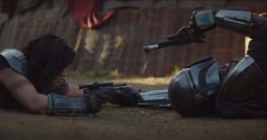 Cuando todo parecía perdido para Mando y Baby Yoda al verse rodeados de todo el gremio de cazarecompensas, la tribu de Mando apareció para salvarlos. Nos encantó ver que utilizaran armas y gadgets diferentes a los que habíamos visto con Mando y que lo apoyaran sin dudarlo.
