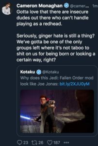 No obstante, un pequeño sector de trolls ha mostrado su descontento hacia el personaje de Cal Kestis interpretado por Cameron Monaghan (Gotham, Shameless), pero no por su actuación ni interpretación… ¡sino por ser pelirrojo!