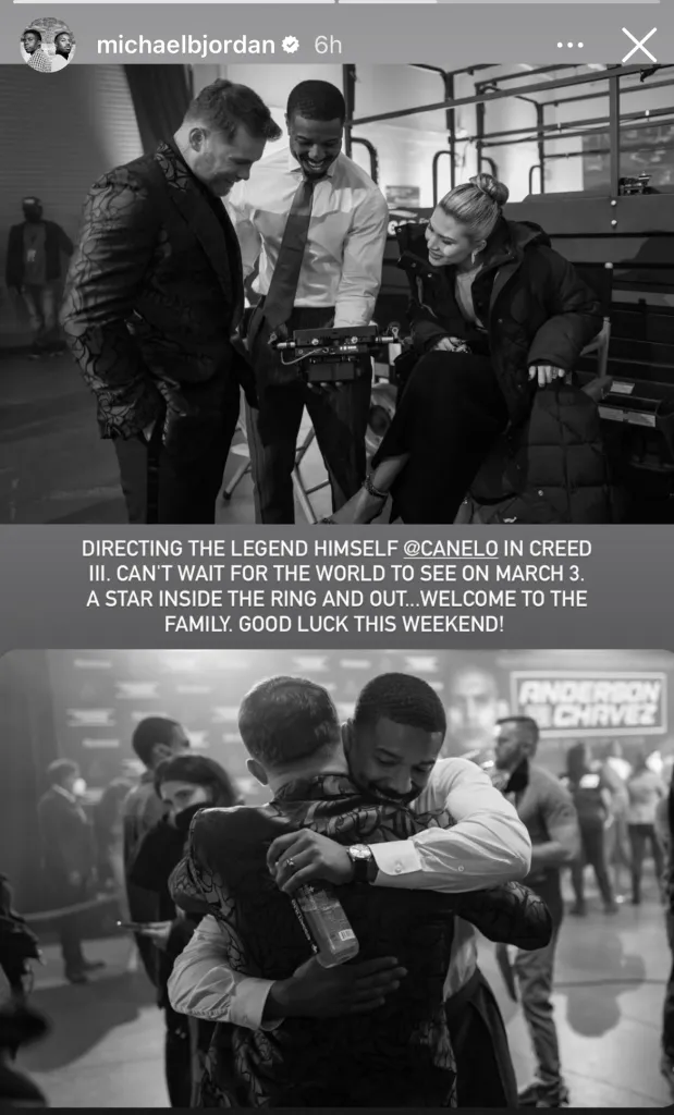 «Dirigiendo a la leyenda misma @Canelo en Creed III. No puedo esperar a que el mundo la vea el 3 de marzo. Una estrella dentro y fuera del ring. Bienvenido a la familia. Buena suerte este fin de semana», escribió Jordan.