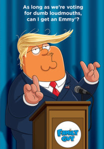 Por un lado, Peter Griffin se mofa del polémico candidato haciendo su propia versión de la campaña. El padre de familia quiere ganarse un premio Emmy, así que Seth MacFarlane y resto del equipo lo someten a voto del público con una imagen que reza: “Ya que estamos votando a tontos escandalosos, ¿puedo yo tener un Emmy?“. Ha habido menciones a Trump en la serie animada, pero esta es la primera vez que se lo muestra en todo su esplendor. Sin embargo, sólo forma parte de la promoción de Family Guy para la entrega de premios, no se trata de algo que aparecerá en un capítulo.