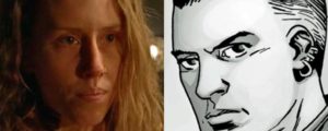 Analicemos quiénes son estas dos adiciones que se suman a la aparición de Ezequiel y su tigre: la primera en realidad debería aparecer más adelante, cuando Negan ya no es el líder, sino Dwight. Ella está de acuerdo en construir un mundo mejor, tal y como pide Rick en el enfrentamiento de bandos. La segunda es una miembro que intenta terminar con la vida de Paul Monroe, es decir, Jesus.