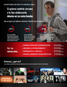 El 80% de los padres admite que ve series como Arrow, Pretty Little Liars y Stranger Things para así sentirse más cerca de sus hijos. Un 74% de los adolescentes está de acuerdo con esto, agregando que estarían interesados en conversar con sus padres sobre las series que ven. Asimismo, 89% de los padres y 70% de los adolescentes ve esto como una gran manera de estrechar lazos.