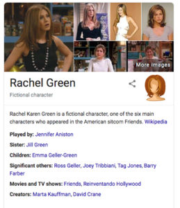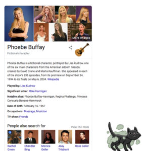 Por ejemplo, si buscas a Rachel Green (Jennifer Aniston) verás una ilustración del famoso peinado que llevaba el personaje en las primeras temporadas, mismo que marcó un referente en la moda conocido como The Rachel. Al hacer click te llevará a una serie de imágenes donde podrás apreciarlo mejor. (Es el elemento menos interesante de los 6 mostrados.)