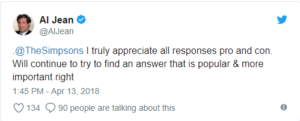 El showrunner de la serie, Al Jean, contestó hoy en su cuenta de Twitter agradeciendo a todos los que reaccionaron al episodio, tanto en contra como a favor, y que seguirán intentando encontrar una respuesta popular y, sobre todo, correcta.