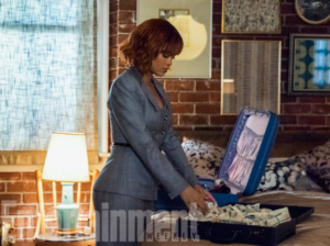 Entertainment Weekly publicó estas fotos donde podemos ver a RiRi como Marion Crane en un coche a través de la lluvia, antes de entrar al motel. En una de las fotos la vemos haciendo una llamada telefónica desde su coche. Otra imagen muestra su encuentro con Norman Bates (Freddie Highmore) y otra se la ve observando una pila de dinero en un maletín.