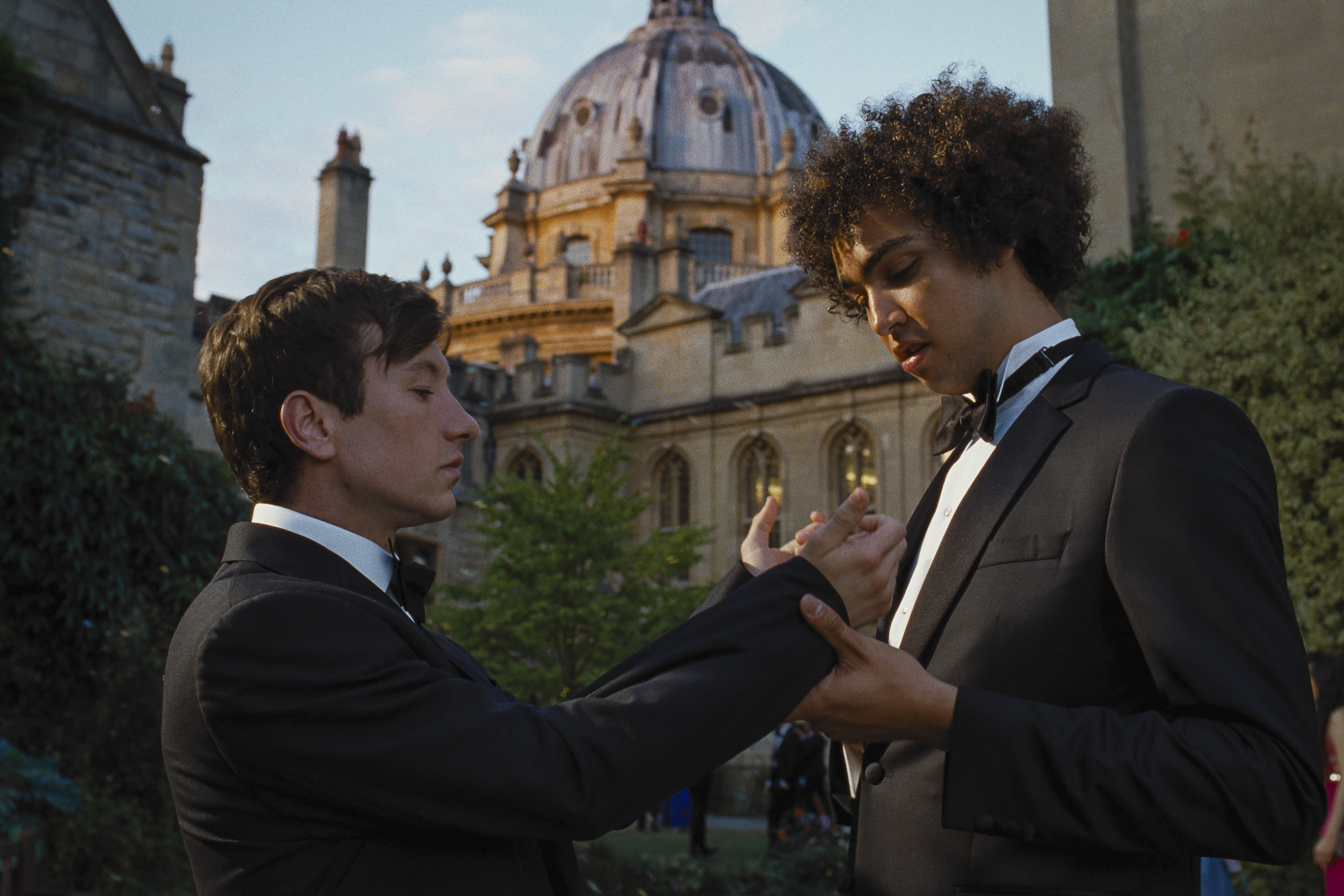 En Saltburn, “luchando por encontrar su lugar en la Universidad de Oxford, el estudiante Oliver Quick (Barry Keoghan) se ve arrastrado al mundo del encantador y aristocrático Felix Catton (Jacob Elordi), quien lo invita a Saltburn, la extensa finca de su excéntrica familia, para pasar un verano inolvidable”.