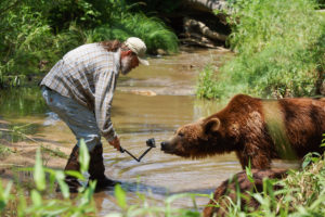 Jeff walks with the bears through the forest.