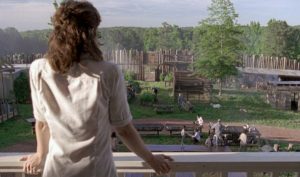 «Aquí vemos una nueva imagen para Maggie y Hilltop«, dijo Kang. «El cambio más obvio para Maggie es que su cabello ha crecido, pero también está de pie en el balcón de la casa Barrington como si fuera su hogar (que ahora lo es), mirando a su próspera comunidad, donde vemos varios elementos nuevos dentro de las paredes. Los lectores de cómics podrían reconocer las mesas comunales y el área de picnic en el césped debajo de Maggie. A la izquierda, podemos echar un vistazo a la fila de remolques y al borde de una nueva estructura unida a ellos. Hay una torre de agua … una puerta está abierta hacia el exterior. ¡Y hay una cabra!»