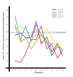 Un escritor londinense llamado Kit Lovelace ha realizado un estudio que ha decidido compartir con todos los fans de Friends allí afuera, en un inesperado servicio a la comunidad (?) que hasta incluye gráficos. ¿Cuánto café crees que bebieron los cinco amigos de Nueva York a lo largo de diez temporadas y 236 episodios? Bueno, la primer respuesta es que la más consumidora ha resultado ser Phoebe Buffay (Lisa Kudrow).