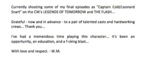 "Rodando algunos de mis últimos episodios como Captain Cold/Leonard Snart en Legends of Tomorrow y The Flash de CW. Agradecido de haber trabajado con un cast y un equipo tan talentosos. He tenido momentos increíbles interpretando a este personaje... Ha sido una oportunidad, una educación y muy explosivo. Con amor y respeto...