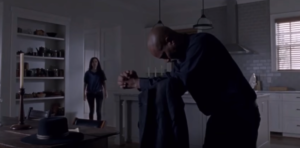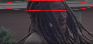 En un momento del tráiler a la segunda mitad de esta novena temporada vemos a la vieja Michonne, bah, a la misma pero con el corte de pelo anterior, asustada y atacando a algo o ALGUIEN.