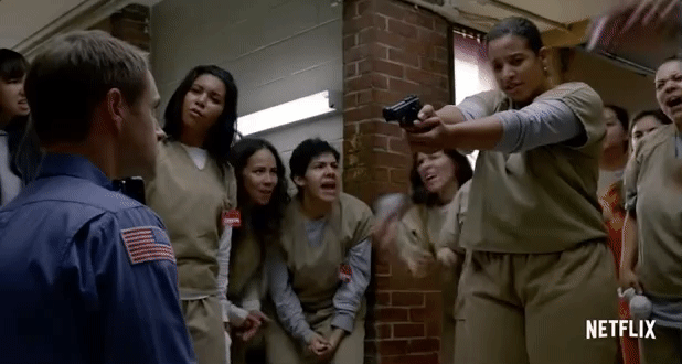 El final de la serie nos muestra cómo el karma funciona cuando vemos a Piscatella ser asesinado por la seguridad que viene a aplacar el motín. Todo termina con Red, Piper, Alex, Nicky, Blanca, Frieda, Crazy Eyes, Cindy, Taystee y Gloria en el bunker uniendo fuerzas esperando saber qué ocurrirá.