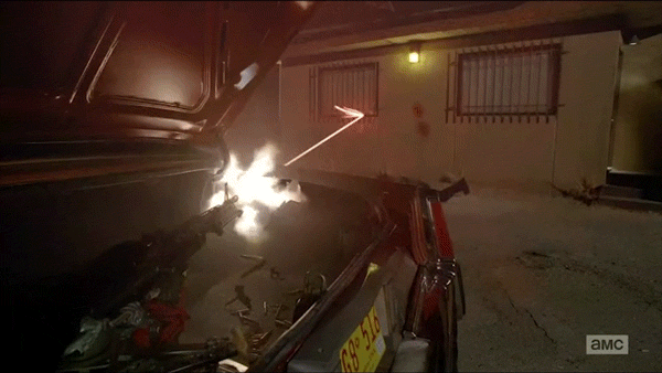 Para resaltar, cabe mencionar el arma que cada personaje utiliza: ambos personajes utilizan armas de pesado calibre, automáticas, de destrucción masiva, podríamos decir, muy populares en las fuerzas armadas estadounidenses según las épocas en las que ambas producciones fueron llevadas a cabo. En Scarface, la Colt AR-15, en Breaking Bad, la M60.
