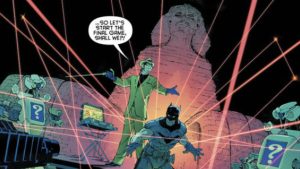 En Batman #712, tras perder contra Bruce una vez más, The Riddler ataca a su hija por decirle que estaba viejo. Él le pregunta «¿Qué es púrpura y verde, y sangra profusamente?», y los lectores nos quedamos con el recuerdo de los gritos de Enigma, pero aún se desconoce su destino.